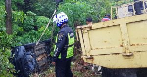 Bintan(HK)-Sebuah mobil mini bus terjungkal ke semak-semak persis ditikungan tajam tak jauh dari Bhadra Resort Jalan Wisata Bahari Km 25 Kawal, Kecamatan