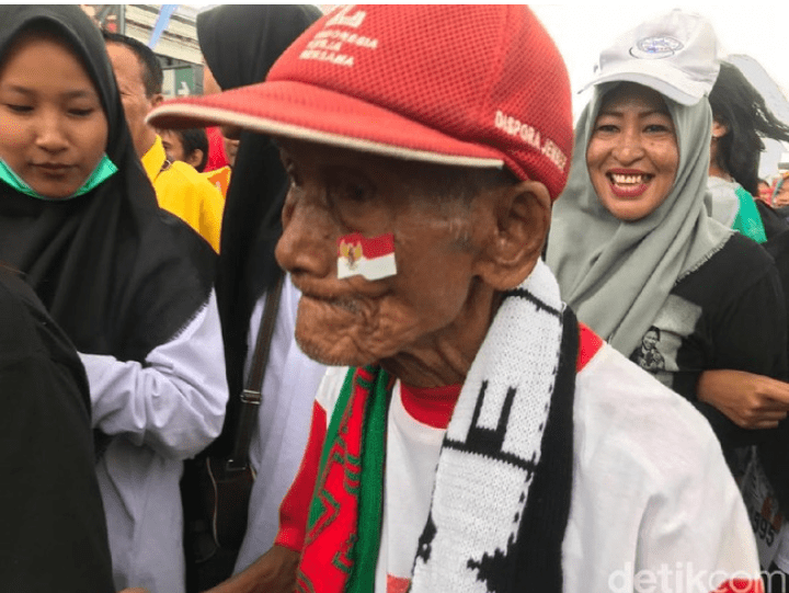 KAKEK berusia 113 yg Ajun ini ikut gerak jalan bersama peserta lainnya.Foto:detik.com