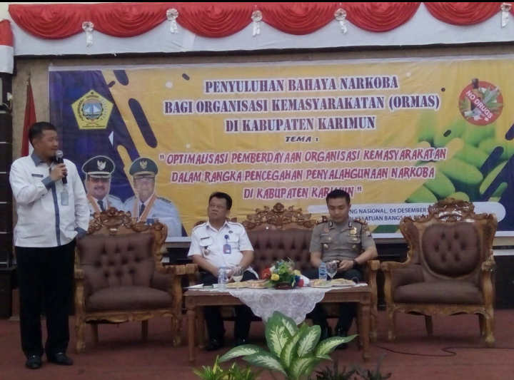 KARIMUN (HK)-Badan Kesatuan Bangsa dan Politik (Kesbangpol) Kabupaten Karimun mengajak organisasi kemasyarakatan (Ormas) di Karimun untuk menosialisasikan bahaya penyalahgunaan narkoba. Ajakan itu disampaikan melalui penyuluhan yang dilaksanakan di Gedung Nasional Tanjungbalai Karimun, Rabu (4/12/2019).