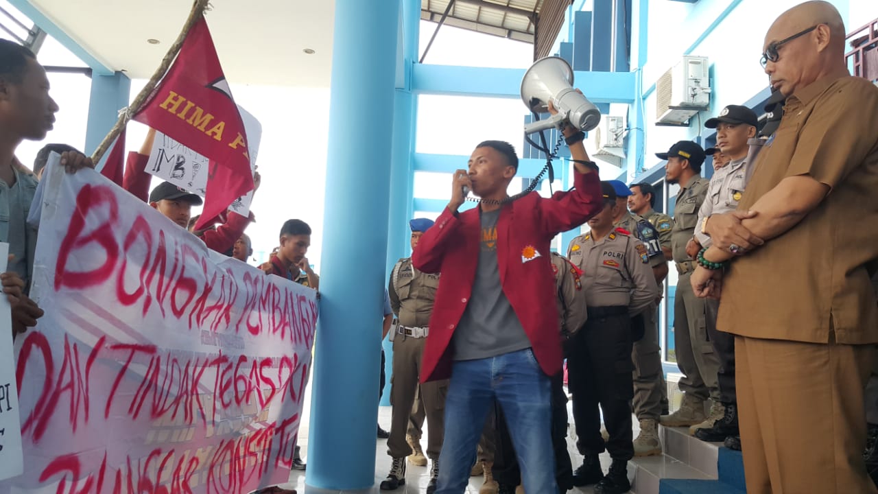 BINTAN (HK) - Sejumlah mahasiswa yang tergabung dalam Himpunan Mahasiswa Persatuan Islam (Hima Persis) berorasi didepan Kantor Dinas Penanaman Modal, Pelayanan Terpadu Satu Pintu (DPMPTSP) Bintan di Bandar Seri Bentan, Bintan Buyu, Senin (30/12/2019).