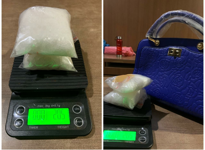 Barang bukti yang diamankan adalah dua bungkus plastik bening berisi Methamphetamine, modus disembunyikan di dalam tas dengan berat brutto 205,1 gram.