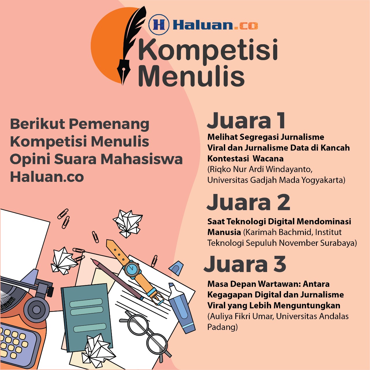 CEOHaluan Media Group (HMG) Brian Putra Bastara mengucapkan terimakasih kepada para mahasiswa yang telah berpartisipasi dalam lomba penulisan opini tematik tersebut. Bagi Haluan.co ini merupakan lomba yang kedua kalinya dan dari penyelengaraan sebelumnya baik secara kuantitas dan kualitas terus meningkat.