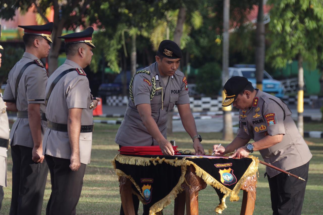 “Bahwa saya akan setia dan taat kepada Negara Kesatuan Republik Indonesia yang berdasarkan Pancasila dan Undang-Undang Dasar Negara Republik Indonesia tahun 1945 serta akan menjalankan segala peraturan perundang-undangan dengan selurus-lurusnya demi dharma bakti saya kepada bangsa dan negara,” demikian para pejabat membaca sumpah didepan Kapolda.