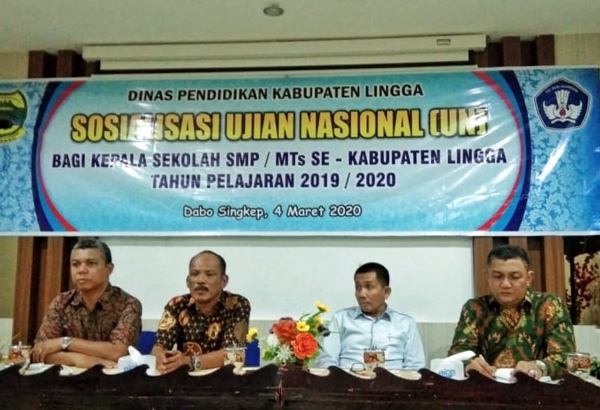 Lingga (HK) - Sebanyak 40 SMP/MTs Se-Kabupaten Lingga mengikuti Sosialisasi Ujian Nasional (UN) tahun pelajaran 2019/2020. Acara itu diselenggarakan di Hotel One Dabo, Kecamatan Singkep, Kabupaten Lingga, Rabu (4/3/2020).