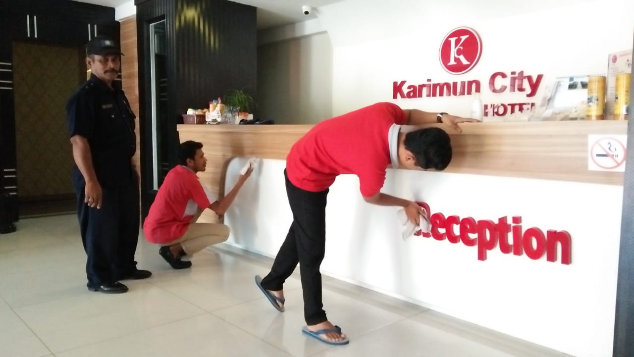 Beberapa titik yang menjadi sasaran aksi bersih-bersih karyawan Karimun City Hotel areal yang sering disentuh oleh pengunjung ataupun tamu hotel seperti gagang pintu masuk hotel, meja resepsionis, pegangan tangga dari lantai satu hingga ke lantai atas hingga ke pintu masuk setiap kamar dan meja serta kursi restoran yang berada di lantai tiga.