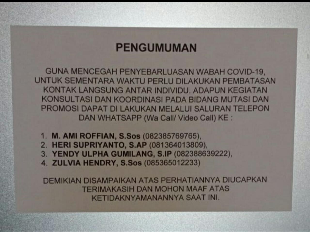 Pembatasan kontak langsung antarpegawai diterapkan sebagai upaya meminimalisir penyebaran virus covid-19. Pengalihan sistem dari kontak langsung menjadi via telpon dan whatapps ini sesuai dengan edaran pemerintah.