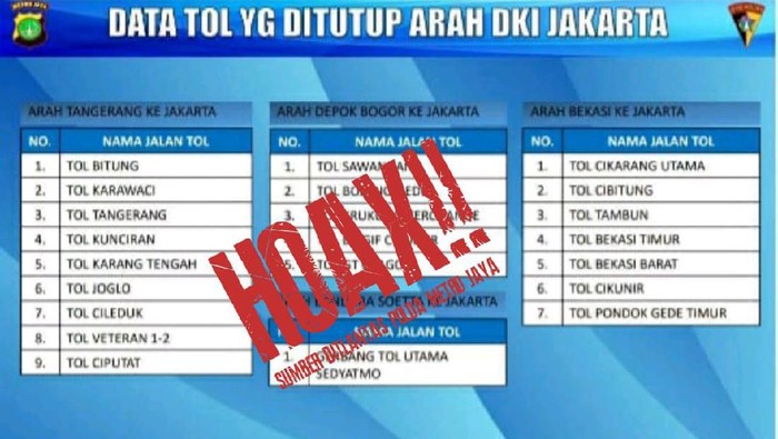 Informasi tersebut tersebar di grup-grup WhatsApp. Informasi tersebut berupa tangkapan layar yang mencantumkan ‘penutupan gerbang-gerbang tol’ yang mengarah ke Jakarta dari arah Tangerang, Bandara Soekarno-Hatta, Depok dan Bogor serta Bekasi. (*)