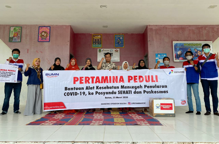 BATAM (HK) - Pertamina memberikan bantuan alat kesehatan pencegah Corona untuk warga Batam. Bantuan disalurkan melalui Posyandu Sehati Pertamina dan Puskemas wilayah Ring I Depot Pengisian Pesawat Udara (DPPU) Hang Nadim, Senin (23/3/2020).