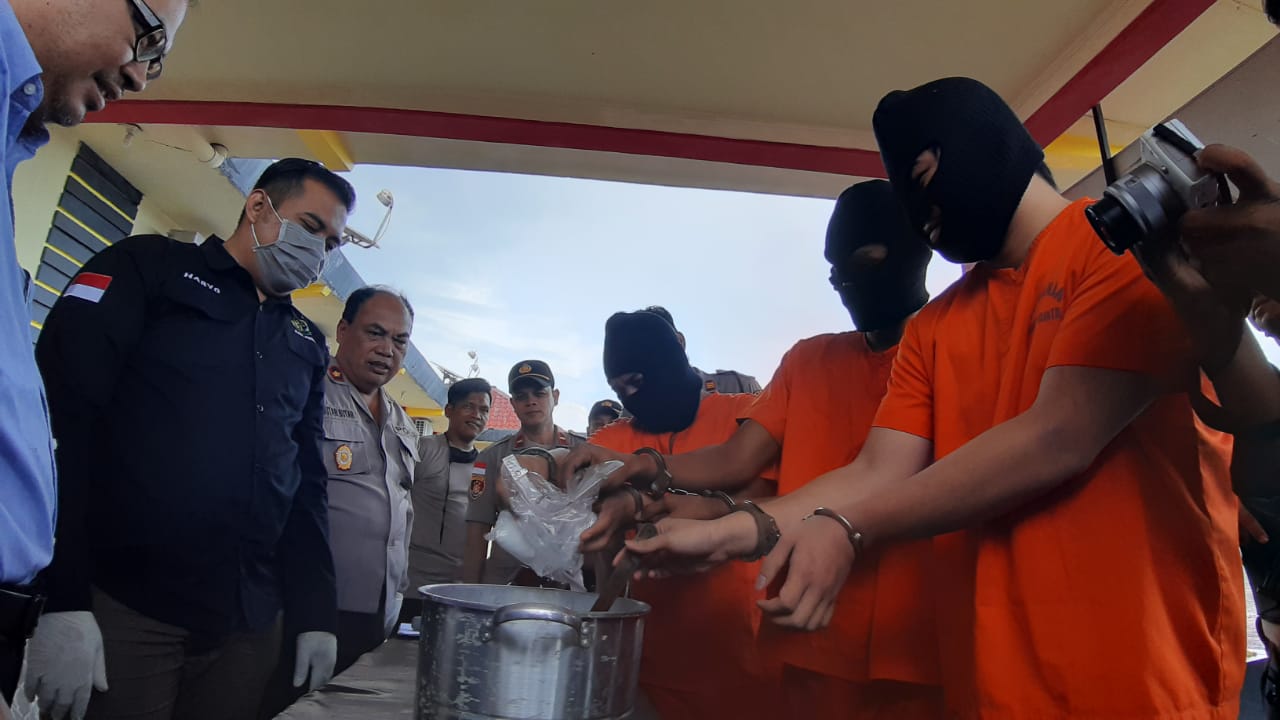 Bintan (HK) - Satres Narkoba Polres Bintan memusnahkan 783,28 gram narkotika jenis sabu-sabu asal Malaysia dengan cara direndamkan kedalam air panas disaksikan Kasipidum Kejari Bintan, pengacara serta ketiga tersangka di Mako Polres Bintan, Senin (23/3/2020) siang.