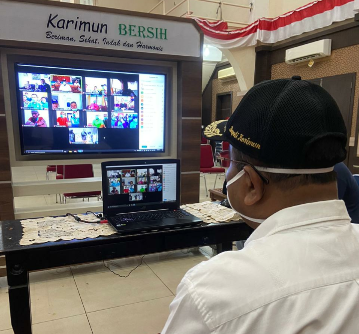 KARIMUN (HK) - Bupati Karimun, Aunur Rafiq melakukan teleconference dengan Unsur Pimpinan Kecamatan (Uspika) terkait percepatan penanganan corona virus disease 2019 (covid-19) 12 Kecamatan di Gedung Nasional Tanjungbalai Karimun, Minggu (29/3/2020).