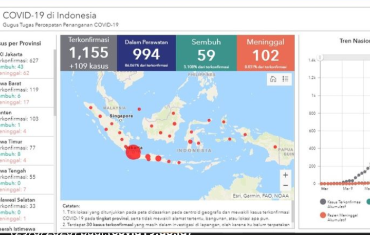 Pada Sabtu (28/3/2020), Indonesia melaporkan tambahan sebanyak 109 kasus baru, sehingga total mencapai 1.155 kasus.