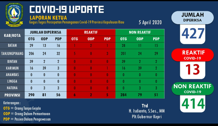 Berikut Update COVID-19 Kepri, Tanggal 5 April 2020 :