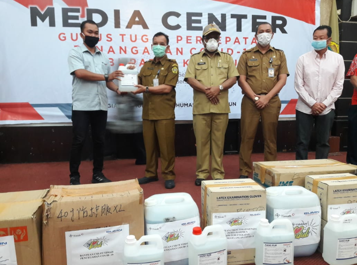 KARIMUN (HK) - PT Timah Tbk Wilayah Operasi Kepri dan Riau menyerahkan bantuan sejumlah alat pelindung diri (APD) dan perlengkapan pencegahan penyebaran virus corona kepada Pemkab Karimun di Gedung Nasional Tanjungbalai Karimun, Senin (6/4/2020).